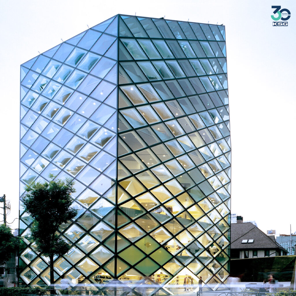 ผลงานต้อนรับศตวรรษที่ 21 ของสถาปนิกผู้ได้รางวัล Pritzker Prize อาคารรูปทรงแปลกตาที่ผสมผสานกระจกแบบต่างๆ เป็นผนังทั้ง 5 ด้าน กระจกเว้าและกระจกนูนช่วยให้ผู้คนมองเห็นสินค้าของ Prada ภายในอาคารอย่างชัดเจน และกระจกฝ้าที่ใช้ปกปิดพื้นที่ที่ต้องการความเป็นส่วนตัว